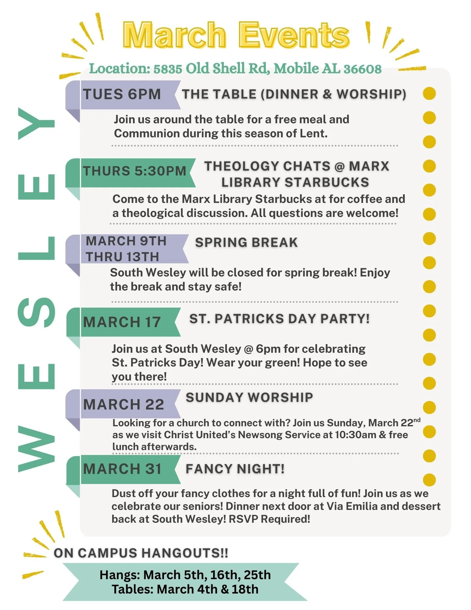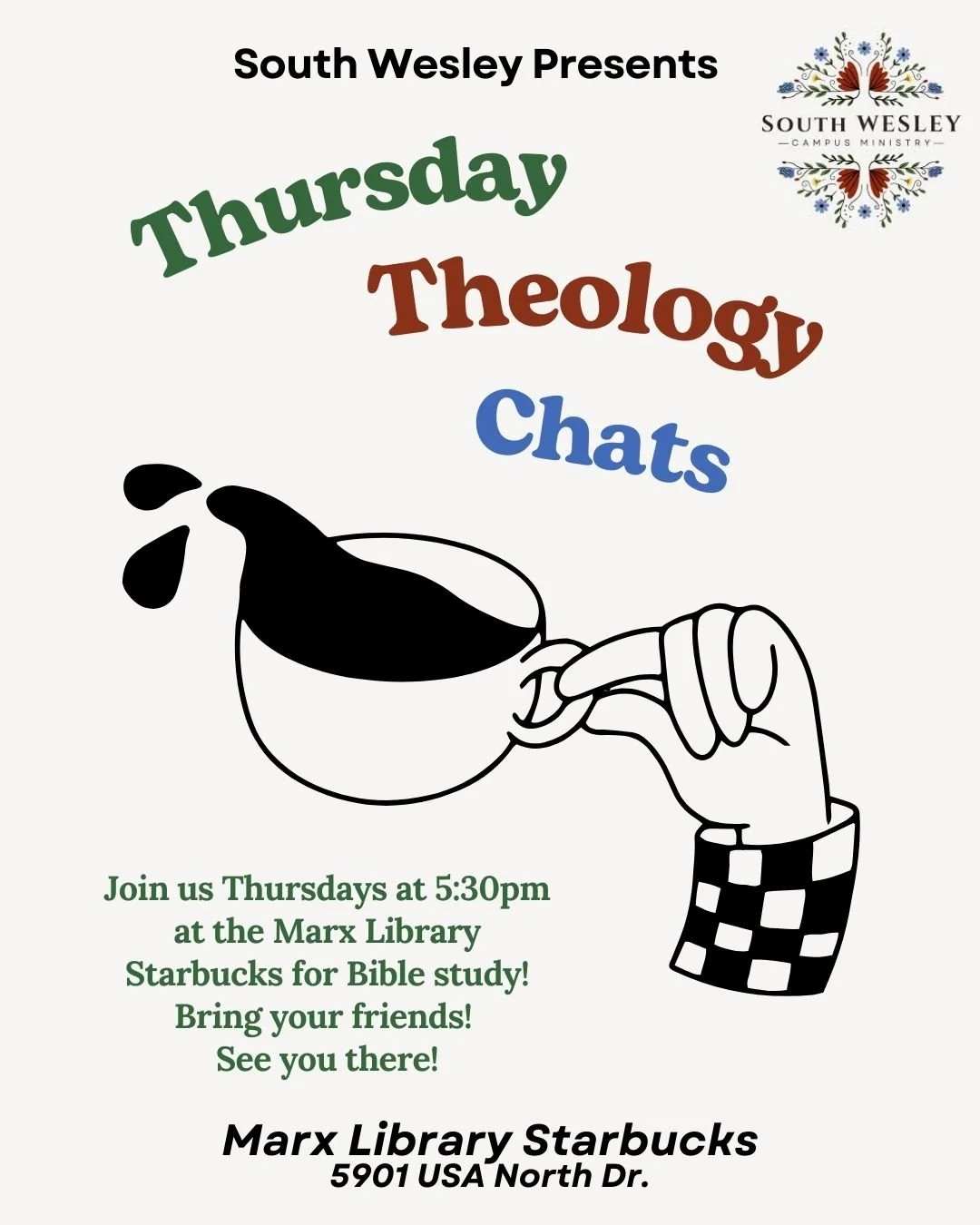 Join Wesley each week for Theology Chats, interactive gatherings designed to spark meaningful conversation about faith, scripture, and the complexities of modern Christianity. These gatherings provide a safe and welcoming space to ask questions, share perspectives, and deepen your understanding of theology and the Bible while learning to articulate your faith in community.